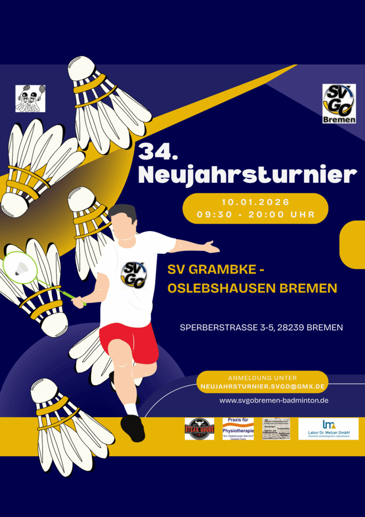 Willkommen bei der Badmintonabteilung! Mitglied werden Badminton Punktspiele Trainingszeiten Aktuelles Zur Ausschreibung des Neujahrturniers 2026 Einladung zur Jahreshauptversammlung der SVGO Badminton-Abteilung Ergebnisse NDEM O35 2025 - Helga Tews Norddeutsche Meisterin mit Walter Beißner im Mixed O 70 und Norddeutsche Vizemeisterin mit Heide Graef im Damendoppel O 70 NDEM O35 2025 Termine 10. Januar 2026 Neujahrsturnier Geschäftsstelle Sportverein Grambke-Oslebshausen e.V. (SVGO) Badmintonabteilung Sperberstr. 3/5 28239 Bremen Tel: 0421-6449361 (Geschäftsstelle) Fax: 0421-6449459 Email: info@svgo-bremen.de Internet: www.svgo-bremen.de Folge uns Instagram Datenschutz Impressum